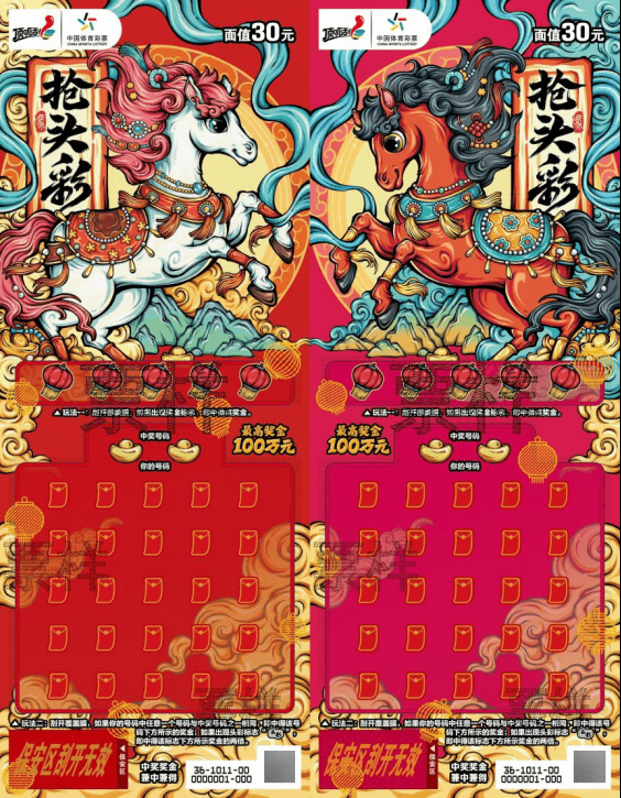 “抢头彩2026”主题即开票则采用国潮插画风格,用复古手绘形式描绘“骏马昂扬向上,抢得头彩”的画面。