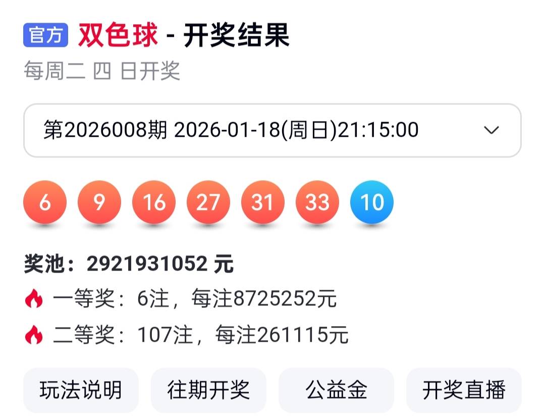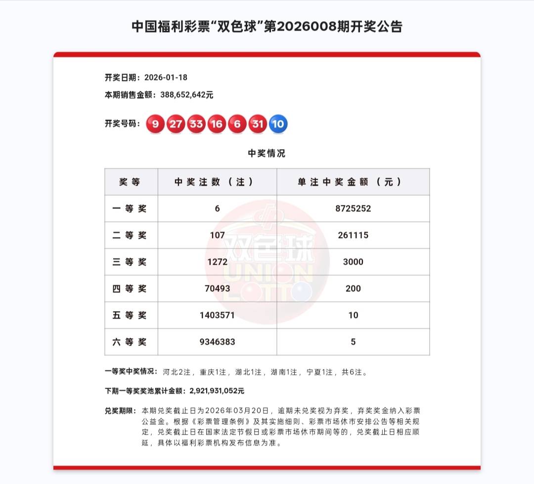 在本期开出6注头奖后,双色球奖池资金不减反增,大幅累积至 29.22亿元,较上期显著增长。