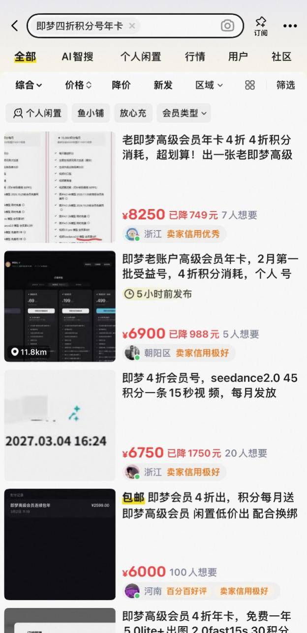 在二手交易平台闲鱼上,即梦4折15000积分、明年2月底前后到期的会员年卡账号普遍在6500元至9500元之间。